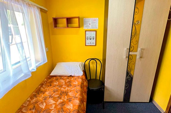 К категории 1-местная (нижняя палуба) относится каюта: 001. Одноместная каюта с частичными удобствами, расположенная на нижней палубе. В каюте: кровать, дополнительное место (кровать), раковина с горячей и холодной водой, столик.