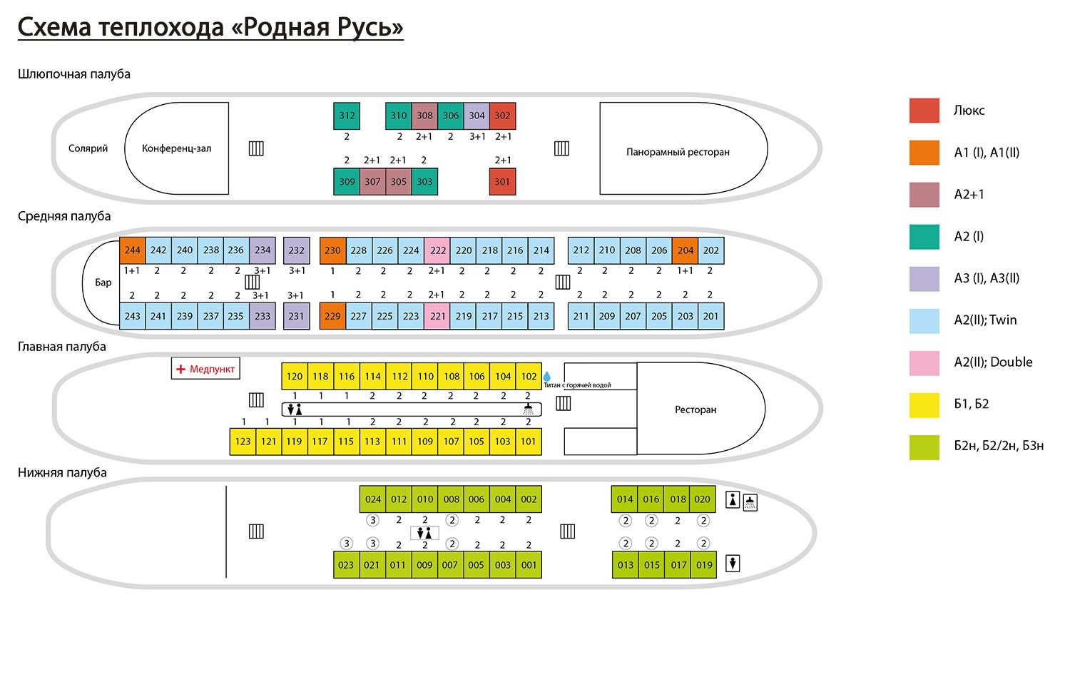 Приглашаем в речной круиз по Волге и Каме на комфортабельном теплоходе-пансионате «Родная Русь». Лайнер может похвалиться хоть небольшими, но удобными каютами. На средней и шлюпочной палубе все каюты с удобствами и душем. Небольшое пространство кают компенсируется отдельным кондиционированием всех кают, кроме нижней палубы. В большинстве кают есть холодильник и спутниковое ТВ.