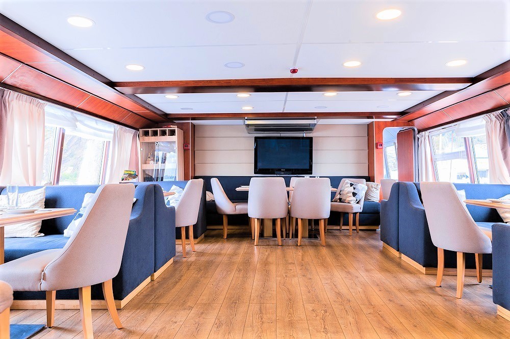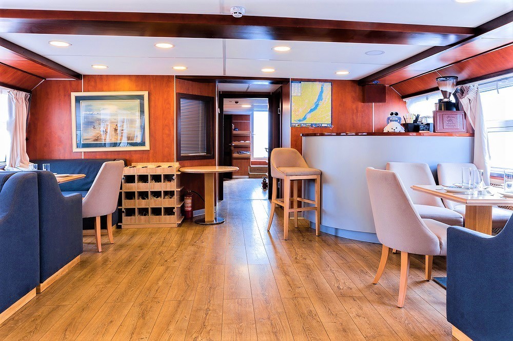 Ресторан на верхней палубе теплохода предлагает трёхразовое питание, включённое в стоимость круиза. Здесь гостей ждёт разнообразное меню с блюдами классической и национальной кухни, приготовленными из свежих ингредиентов. Уютная атмосфера и панорамные виды создают комфортные условия для приятного отдыха и наслаждения каждым приёмом пищи в течение путешествия.