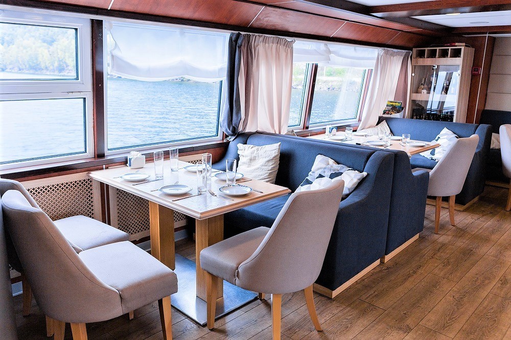 На борту теплохода гостям предлагается разнообразное и полноценное трёхразовое питание, включённое в стоимость круиза. Основной приём пищи организован в ресторане, расположенном на верхней палубе, где царит уютная атмосфера и открываются живописные виды.